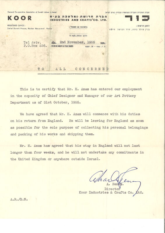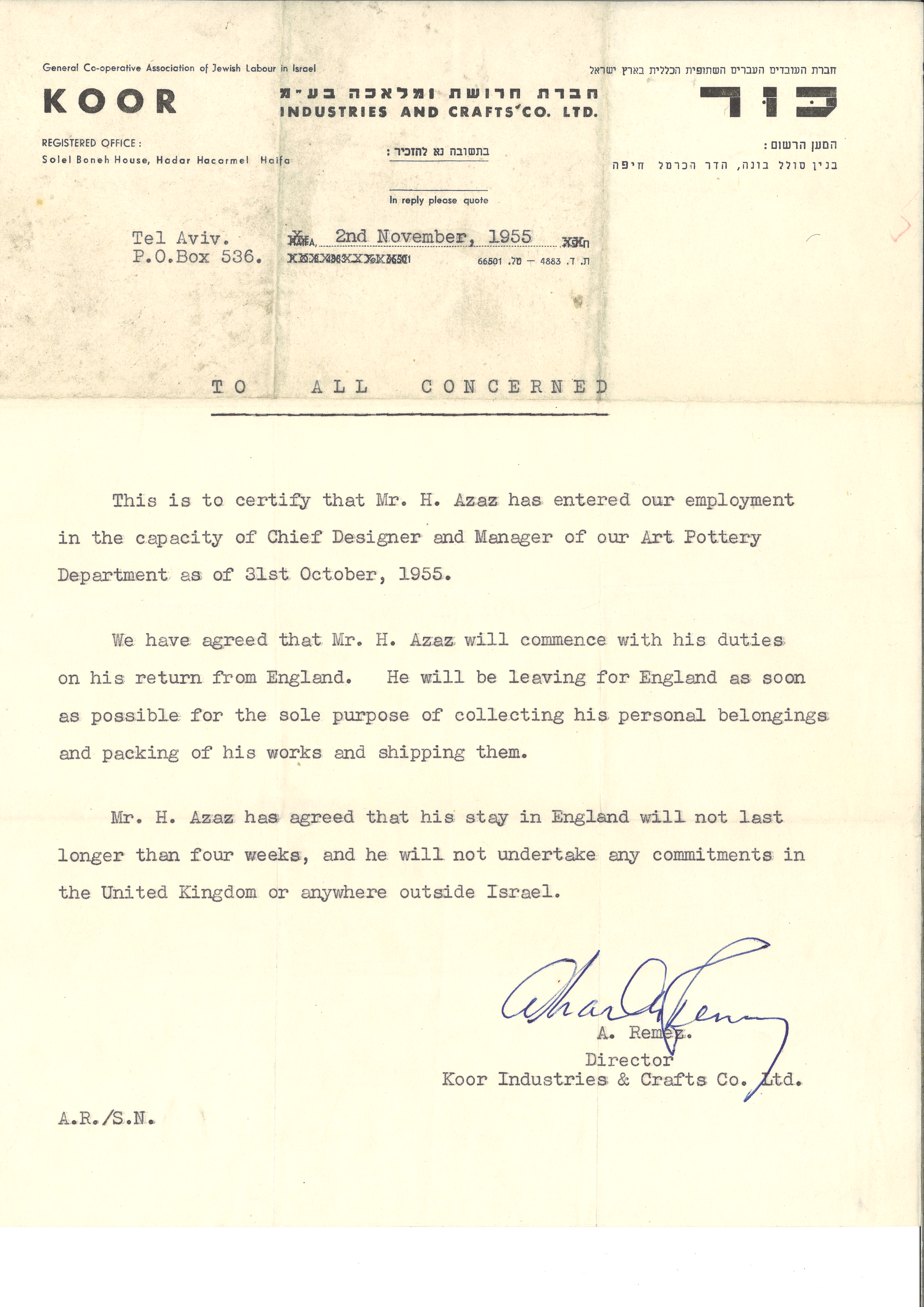 אישור מהנהלת "כור" על נסיעתו לאנגליה של נחמיה עזז ועל הבטחת חזרתו לישראל